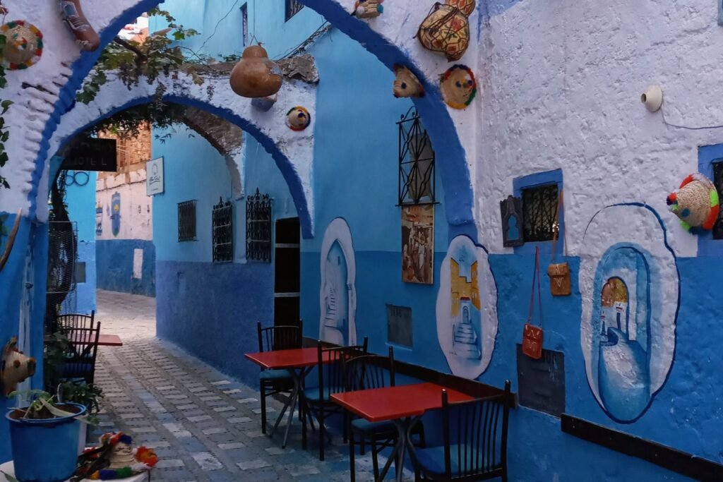 Don’t miss the chance to sip a glass of fresh mint tea while overlooking the blue streets.